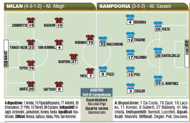 FANTACALCIO MILAN SAMPDORIA PROBABILI FORMAZIONI – Il Milan ospiterà questa la Sampdoria nell’anticipo serale della 33esima giornata di campionato. I rossoneri giocheranno ancora senza Nesta, mentre in attacco Robinho prenderà il posto di Ibrahimovic. Ecco le probabili formazioni del Corriere dello Sport.