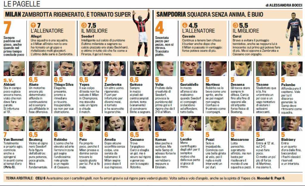 FANTACALCIO MILAN SAMPDORIA VOTI PAGELLE GAZZETTA VIDEO HIGHLIGHTS – In foto trovate i voti e le pagelle della partita Milan-Samporia. In basso invece la classifica della Serie A e gli highlights della partita.