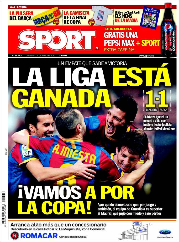 SPORT LIGA – Il quotidiano Spagnolo Sport, vicino al Barcellona, analizza il Clasico di ieri sera con una fotonotizia. Il pareggio di ieri sera tra Real e Barça ha garantito ai Catalani il distacco già maturato nelle precedenti giornata: gli azulgrana, vinto il campionato, devono concentrarsi sulle coppe.