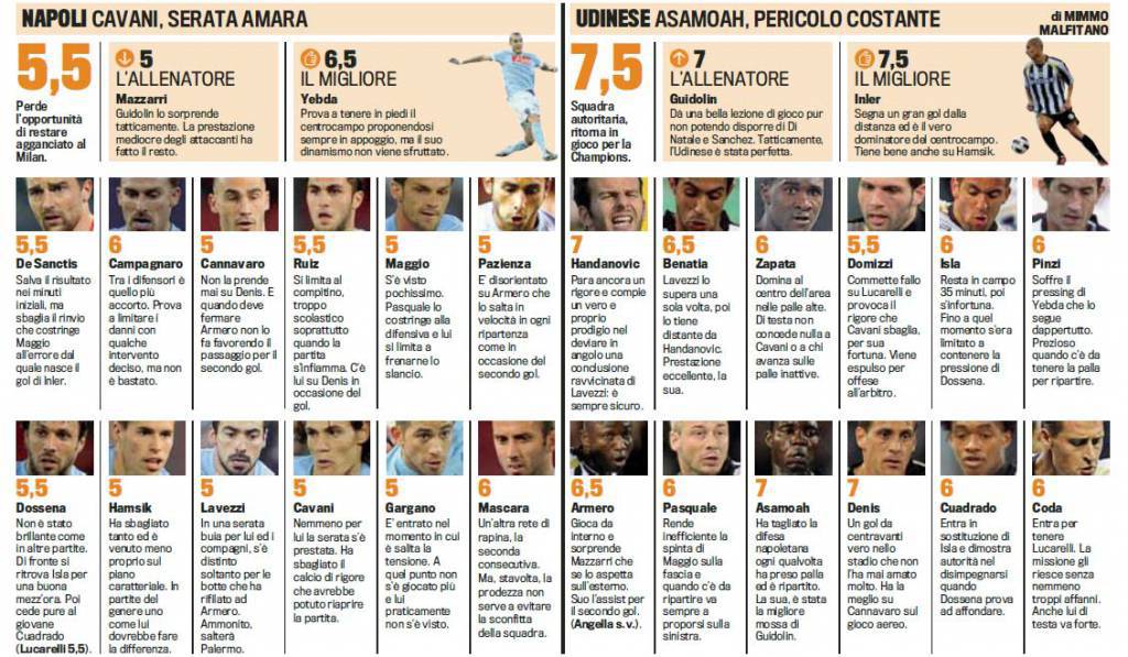 NAPOLI UDINESE FANTACALCIO VOTI PAGELLE GAZZETTA – Il Napoli perde due a uno in casa contro l’Udinese e dice addio ai sogni Scudetto. Per i friulani in gol Inler, il migliore in campo, e l’ex Denis. Nel Napoli pessima prova di Cavani che ha sbagliato un rigore. I voti della Gazzetta dello Sport.