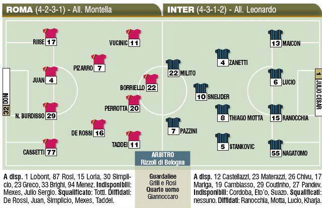 COPPA ITALIA ROMA INTER PROBABILI FORMAZIONI – Questa sera Roma-Inter daranno vita alla prima semifinale della Coppa Italia. L’andata è all’Olimpico, i giallorossi giocheranno senza Totti che si accomoderà in panchina, mentre tra i nerazzurri mancherà Eto’o, non convocato. Ecco le probabili formazioni del Corriere dello Sport.