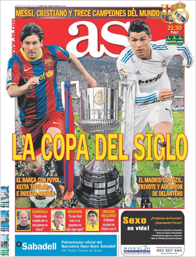 AS BARCELLONA REAL MADRID – Anche il quotidiano As parla della finale di Copa del Rey di questa sera tra Real Madrid e Barcellona, definitiva Coppa del secolo.