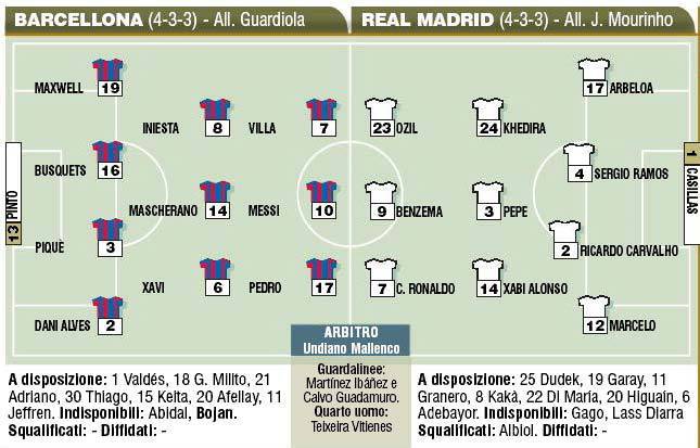 COPA DEL REY BARCELLONA REAL MADRID PROBABILI FORMAZIONI – Questa sera grande sfida in Spagna tra Barcellona e Real Madrid nella finale della Copa del Rey. I blaugrana lanciano Mascherano a centrocampo con Busquets che potrebbe essere dirottato in difesa qualora non recuperasse Puyol. Mourinho invece punta su Pepe mediano davanti alla difesa, con il tridente d’attacco formato da Ozil-Benzema-Cristiano Ronaldo. Le probabili formazioni del Corriere dello Sport.