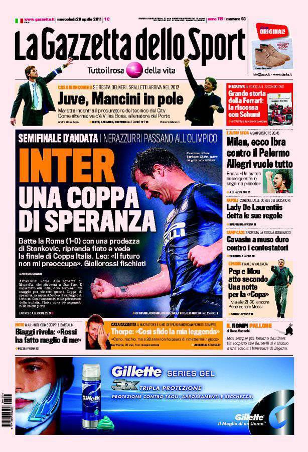 GAZZETTA INTER COPPA ITALIA – Sulla Gazzetta dello Sport si parla della vittoria dell’Inter sulla Roma per uno a zero nella semifinale d’andata della Coppa Italia.