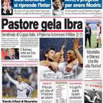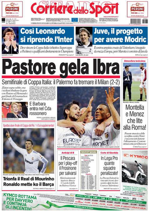 Corriere dello Sport: Pastore gela Ibra 21/04/2011 di Ruggieri CORRIERE PASTORE IBRA – Sul Corriere dello Sport si parla della bella prestazione del Palermo che a San Siro contro il Milan pareggia due a due nell’andata della semifinale di Coppa Italia. Claudio Ruggieri – www.calciomercatonews.com