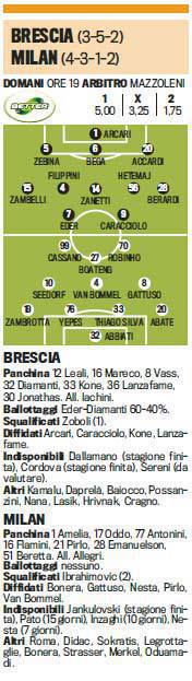 FANTACALCIO BRESCIA-MILAN PROBABILI FORMAZIONI SERIE A – Se non è un match point, poco ci manca: vincendo a Brescia il Milan chiuderebbe quasi definitivamente il campionato. Una sfida che a dispetto delle posizioni di classifica è più ardua del previsto: il Brescia è alla ricerca disperata di punti salvezza ed ha un organico comunque importante (il tridente Diamanti-Eder-Caracciolo è di tutto rispetto). I rossoneri partono chiaramente favoriti ma devono fare i conti con le assenze di Pato e Ibrahimovic: probabile quindi un attacco con Cassano e Robinho. Le rondinelle tenteranno di chiudere tutti gli spazi per ripartire in contropiede sfruttando le sponde di Caracciolo e la velocità e fantasia di Eder.Ecco in foto le probabili formazioni della Gazzetta:
