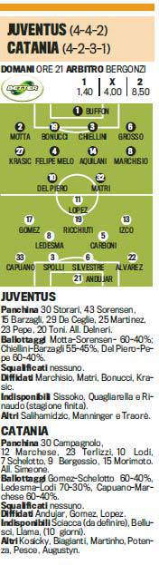 FANTACALCIO JUVENTUS-CATANIA SERIE A PROBABILI FORMAZIONI – Difficile che la Juventus possa raggiungere il quarto posto: in ogni caso la squadra deve provarci e sperare in un miracolo. Il Catania è a +4 dalla terz’ultima e non può certo sentirsi del tutto al sicuro quindi cercherà in ogni modo di portare a casa almeno un punto dalla sfida. La Juventus dovrebbe affidarsi alla coppia di attacco Del Piero-Matri: il fantasista ha dato un po’ di movimento in attacco quando è subentrato contro la Fiorentina. Il Catania schiererà invece a supporto dell’unica punta il vivace Gomez, Ricchiuti e Izco per un attacco tutto sudamericano che punta su tecnica e fantasia al servizio del bomber Maxi Lopez, certamente non nella sua stagione migliore. Ecco in foto le formazioni della Gazzetta: