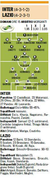 FANTACALCIO SERIE A GAZZETTA INTER-LAZIO – Spareggio per l’accesso diretto alla Champions League: la partita tra Inter e Lazio promette scintille. I nerazzurri vogliono fare loro la partita a tutti i costi, dopo il brutto ko al Tardini contro il Parma; i biancocelesti vogliono capitalizzare al massimo questa stagione sopra le aspettative e vogliono ripetere il successo dell’andata, affidandosi alla vena balistica di Hernanes e ad un ritrovato Zarate che nella partita contro il Catania ha mostrato i numeri per cui è diventato famoso. L’Inter si affiderà probabilmente al duo Pazzini-Eto’o, a secco nelle ultime gare ma desideroso di segnare gol importanti per chiudere positivamente la stagione. Ecco in foto le probabili formazioni della Gazzetta: