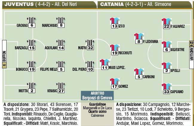 CALCIO SERIA A PROBABILI FORMAZIONI JUVENTUS CATANIA- L’odierna giornata di campionato si chiuderà con il posticipo delle 21, che vedrà affrontarsi Juventus e Catania. Delneri non ha ancora recuperato Chiellini e De Ceglie e dovrà dunque confermare Grosso come terzino sinistro e Barzagli come centrale al fianco di Bonucci. Secondo Il Corriere dello Sport, inoltre, Del Piero partirà titolare al fianco di Matri. Il Catania, a caccia di punti salvezza, recupera Izco che, secondo il quotidiano capitolino, giocherà come esterno destro alto al posto di Schelotto, che lo aveva sostituito nelle ultime uscite. Recuperato anche Capuano, che riprenderà il suo posto come terzino sinistro, e Spolli, che torna al centro della difesa. Di seguito le formazioni in foto.