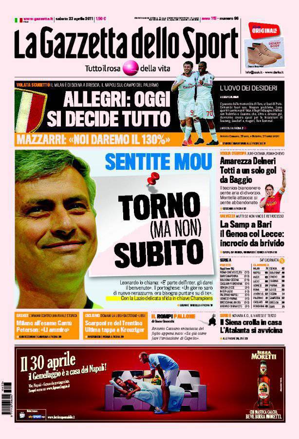 Gazzetta dello Sport: Sentite Mou “Torno, ma non subito” 23/04/2011 di Ruggieri GAZZETTA MOURINHO INTER – Sulla Gazzetta dello Sport si parla del possibile ritorno all’Inter di Mourinho. Lo Special One ha dichiarato che un giorno ritornerà all’Inter ma non nella prossima stagione. Claudio Ruggieri – www.calciomercatonews.com