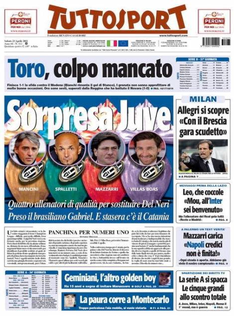 TUTTOSPORT JUVENTUS ALLENATORE – Su Tuttosport si parla del possibile tecnico della Juventus per la prossima stagione. Quattro in lizza per la panchina, Mancini, Spalletti, Mazzarri e Villas Boas.
