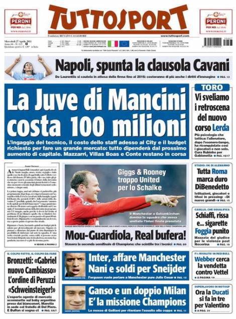 TUTTOSPORT MANCINI JUVENTUS – Su Tuttosport si parla del mercato Juventus che pensa a Mancini per la panchina. Ma per ingaggiare il manager del City servirebbero 100 milioni di euro.