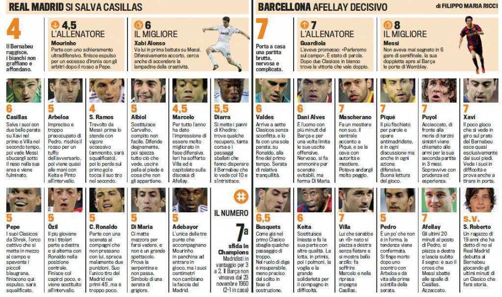 CHAMPIONS LEAGUE REAL MADRID BARCELLONA PAGELLE – Il Barcellona vince due a zero contro il Real Madrid nell’andata della semifinale di Champions League. Al Bernabeu decide una doppietta di un fantastico Lionel Messi, migliore in campo. Delude Ronaldo, così come tutto il Real Madrid di Mourinho. Ecco le pagelle della Gazzetta dello Sport.