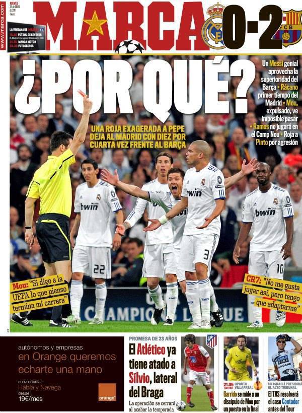 MARCA PEPE REAL MADRID BARCELLONA – Sul quotidiano Marca si parla del due a zero del Barcellona sul Real Madrid nella semifinale d’andata di Champions League giocata al Bernabeu. I madrileni contestano l’espulsione di Pepe.
