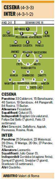 FANTACALCIO CESENA INTER PROBABILI FORMAZIONI – Domani pomeriggio l’Inter giocherà a Cesena contro i padroni di casa e cercherà di mantenere il secondo posto in classifica. I romagnoli invece dovranno vincere per sperare nella salvezza. Ecco le probabili formazioni secondo il Corriere dello Sport.