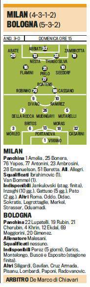 FANTACALCIO MILAN BOLOGNA PROBABILI FORMAZIONI FOTO – Il Milan domenica pomeriggio giocherà in casa contro il Bologna ormai salvo. I rossoneri in caso di vittoria e di pareggio dell’Inter a Cesena sarebbero matematicamente Campioni d’Italia. Ecco le probabili formazioni secondo il Corriere dello Sport.