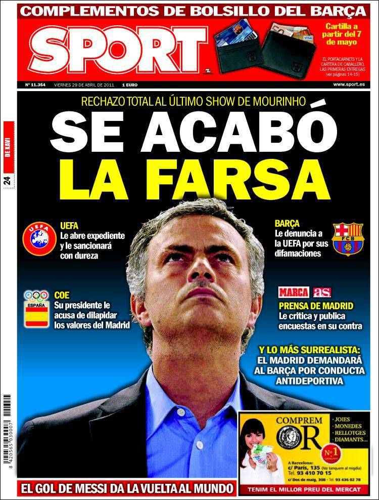 SPORT MOURINHO – Sull’altro quotidiano catalano Sport si parla delle dichiarazioni di Mourinho nel post partita. Dichiarazioni che hanno portato alla denuncia del Barcellona nei confronti del portoghese e all’apertura di un’inchiesta da parte dell’Uefa.