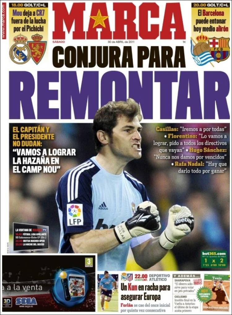 MARCA RIMONTA CASILLAS – Sul quotidiano Marca si parla del Real Madrid che è pronto alla grande rimonta al Camp Nou dopo la sconfitta per due a zero.