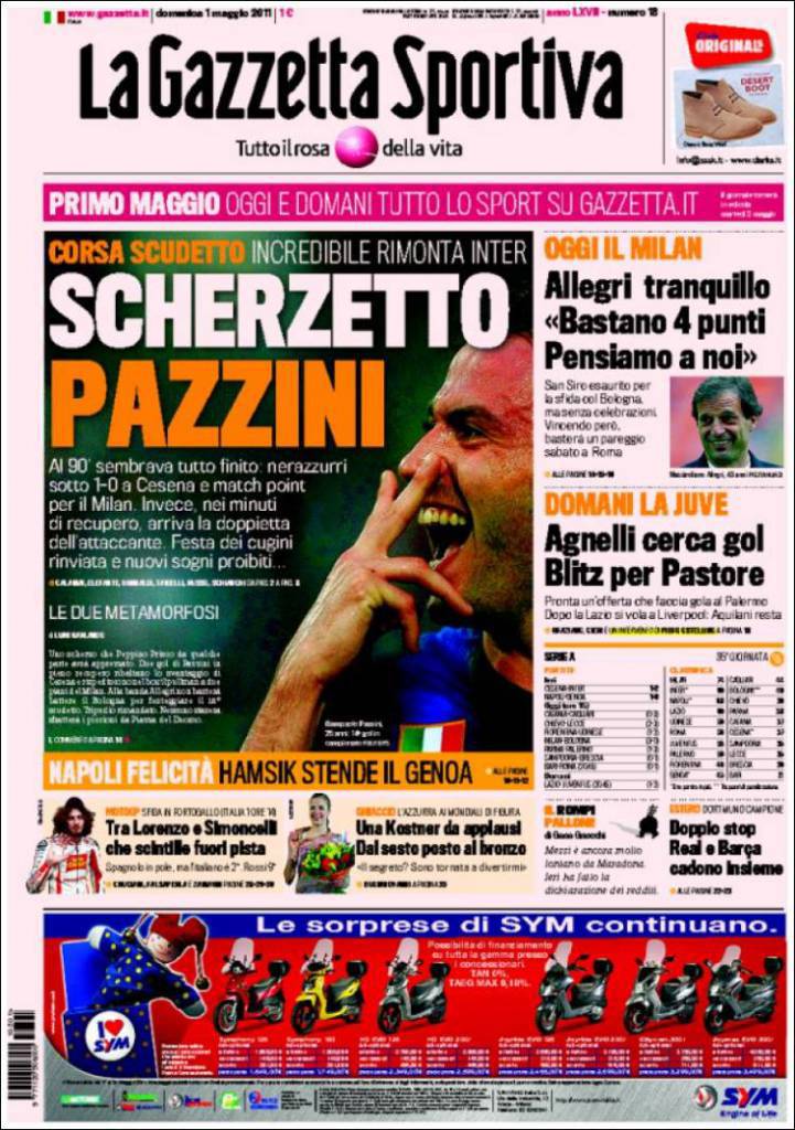 GAZZETTA DELLO SPORT PAZZINI – Mentre lo scudetto sembrava ormai cucito sul petto del Milan, Giampaolo Pazzini ha sparigliato tutte le carte in tavola, regalando un successo insperato ai nerazzurri: dedica a lui la prima pagina la Gazzetta dello Sport. Il Pazzo, ‘ eroe della giornata di ieri, con una doppietta è riuscito a risolvere la pratica Cesena nei minuti finali.