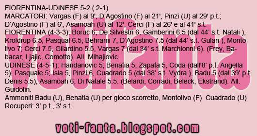 FANTACALCIO VOTI PAGELLE FIORENTINA UDINESE GAZZETTA – La Fiorentina stravince contro l’Udinese per cinque a due, regalando un grande spettacolo ai tifosi viola. Doppietta per Cerci e D’Agostino, bel gol di Pinzi nell’Udinese. Ecco i voti e le pagelle della Gazzetta dello Sport.