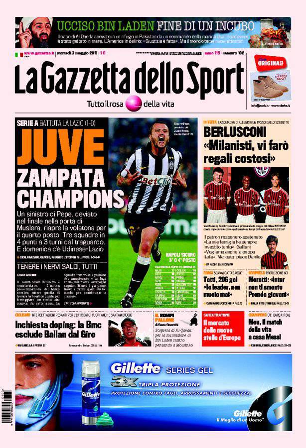 GAZZETTA JUVE CHAMPIONS – Sulla Gazzetta dello Sport si parla della vittoria della Juventus sul campo della Lazio con il gol di Pepe nel finale.