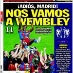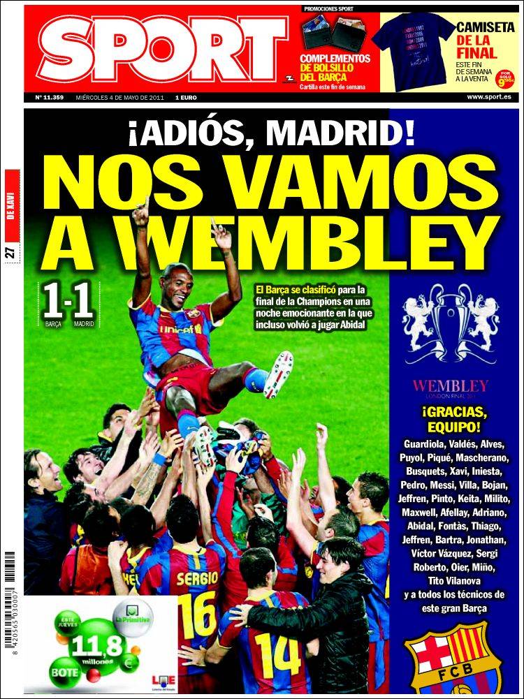 Sport: Addio Madrid, noi andiamo a Wembley 04/05/2011 di Ruggieri SPORT BARCELLONA – Il quotidiano catalano Sport irride il Real Madrid e festeggia la qualificazione in finale di Champions League del Barcellona. Claudio Ruggieri – www.calciomercatonews.com