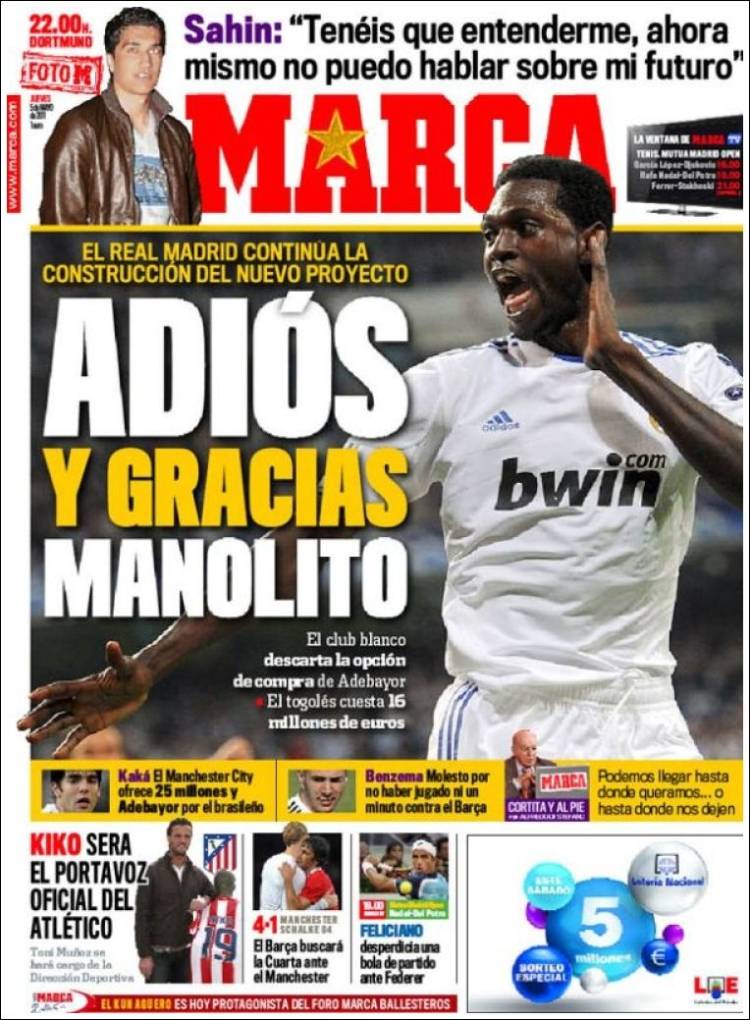 Marca: Addio e grazie “Manolito” 05/05/201105/05/2011 di admin MARCA RASSEGNA STAMPA PRIMA PAGINA – Il Real Madrid non ha intenzione di riscattare Emanuel Adebayor, attaccante del Manchester City in prestito da gennaio. Il togolese farà così ritorno in Premier League. La redazione di Calciomercatonews.com