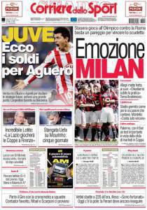 RASSEGNA STAMPA CORRIERE DELLO SPORT PRIMA PAGINA CALCIOMERCATO JUVENTUS AGUERO BENZEMA- Il Corriere dello Sport riporta oggi in copertina una notizia di mercato riguardante uno dei grandi obiettivi della Juventus: Aguero. Spazio anche al campionato, con il Milan che può festeggiare già stasera.