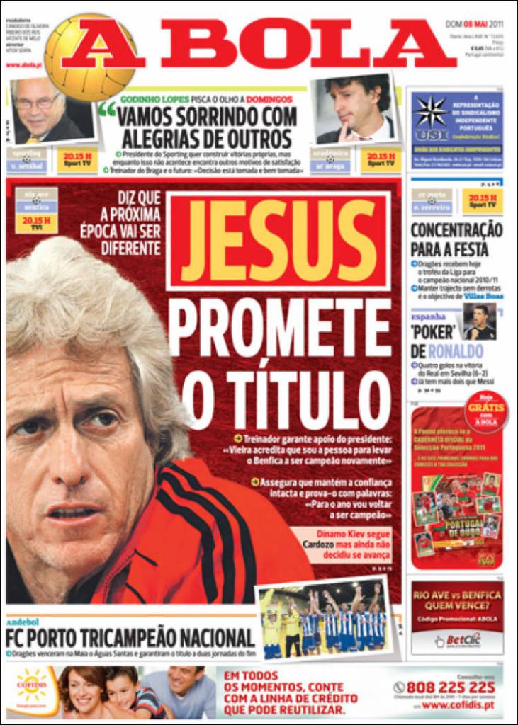 A BOLA – Jorge Jesus, l’allenatore del Benfica, non deve aver passato una bella stagione: una rincorsa, risultata poi vana dietro al Porto e la finale mancata di Europa League. Ma al quotidiano A Bola, l’allenatore ha rimesso le carte in tavola per il titolo nazionale del prossimo anno.