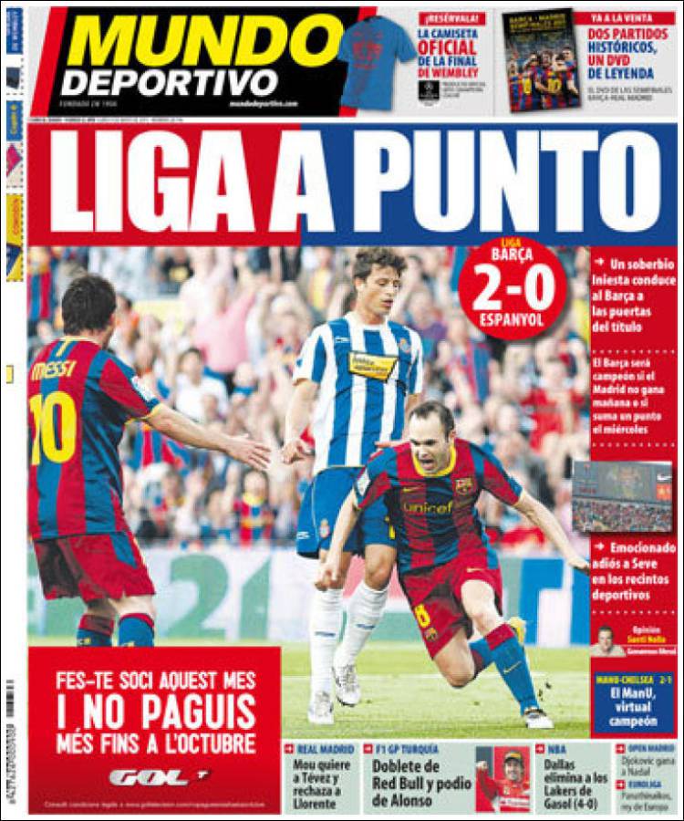 MUNDO DEPORTIVO LIGA – Sul quotidiano catalano Mundo Deportivo si parla del Barcellona che con la vittoria di ieri contro l’Espanyol è vicino alla vittoria della Liga. Manca solo un punto.
