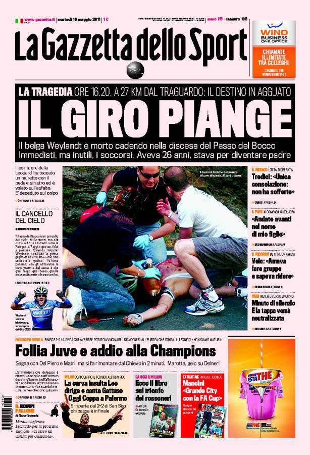 GAZZETTA GIRO MORTE – Sulla Gazzetta dello Sport si parla purtroppo della morte del ciclista Weylandt durante la tappa del Giro d’Italia.