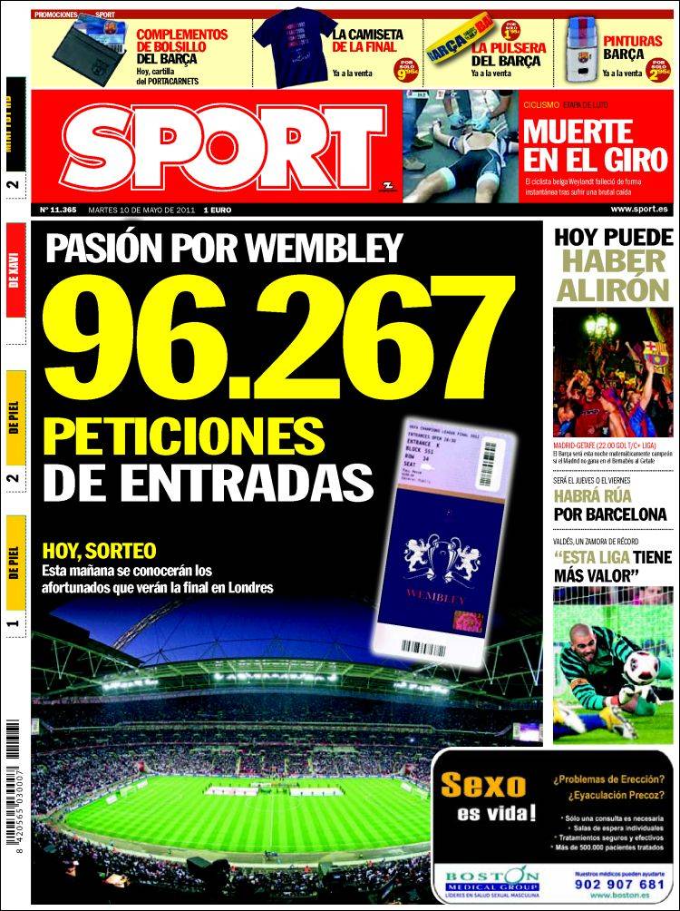 SPORT BIGLIETTI CHAMPIONS – Sul quotidiano catalano Sport si parla della finale di Champions League con quasi 97 mila tifosi del Barcellona che hanno richiesto il biglietto.