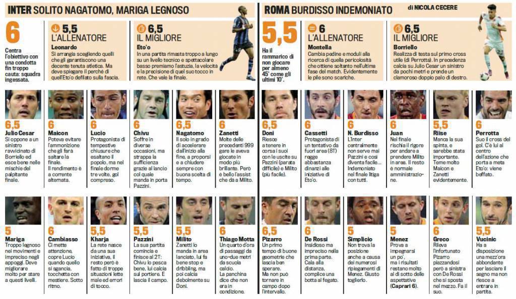 VOTI PAGELLE GAZZETTA FOTO COPPA ITALIA INTER ROMA – L’Inter pareggia uno a uno contro la Roma e vola in finale di Coppa Italia dove incontrerà il Palermo. Bene Eto’o e Nagatomo nell’Inter, nella Roma ottima la prestazione di Borriello. I voti e le pagelle della Gazzetta dello Sport.