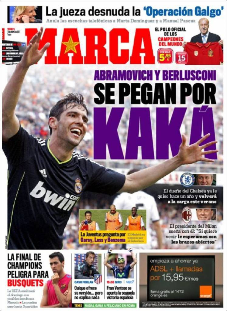 Marca: Abramovich e Berlusconi si sfidano per Kakà 13/05/2011 di Ruggieri MARCA ABRAMOVIC BERLUSCONI KAKA’ – Sul quotidiano Marca si parla di Kakà con Chelsea e Milan pronti a duellare per arrivare al brasiliano. Claudio Ruggieri – www.calciomercatonews.com