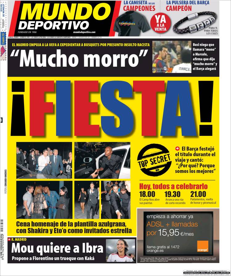 MUNDO DEPORTIVO BARCELLONA – Il Barcellona ha festeggiato il terzo scudetto consecutivo facendo un party privato in cui sono stati invitati Shakira, fidanzata di Piquè e l’ex giocatore blaugrana Eto’o.