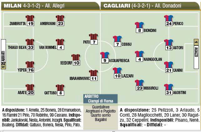 FANTACALCIO MILAN CAGLIARI PROBABILI FORMAZIONI FOTO – Il Milan questa sera ospiterà il Cagliari a San Siro per festeggiare lo Scudetto. Allegri ritroverà Pato dopo l’infortunio muscolare subito contro la Sampdoria. Ecco le probabili formazioni riportate dal Corriere dello Sport.