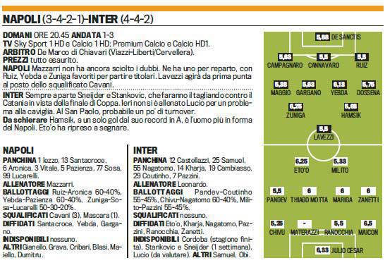 FANTACALCIO NAPOLI INTER PROBABILI FORMAZIONI FOTO – Domenica sera ci sarà il posticipo della 37esima giornata di Serie A. Al San Paolo di Napoli si affronteranno i padroni di casa e l’Inter. Manca un punto al Napoli per volare direttamente in Champions League, Mazzarri dovrà fare a meno di Cavani. Ecco le probabili formazioni secondo la Gazzetta dello Sport.