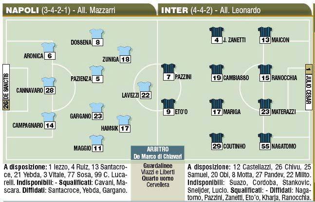 FANTACALCIO NAPOLI INTER FORMAZIONI – Il Napoli e l’Inter si affrontano al San Paolo per una sfida che può valere per l’assegnazione del secondo e del terzo posto. Il Napoli ha un incentivo in più da questa gara perchè potrebbe regalarle l’accesso diretto alla Champions League anche solo pareggiando la gara. Walter Mazzarri mette Lavezzi a sostituzione di Cavani come terminale offensivo mentre Leonardo risponde con l’inserimento del brasiliano Coutinho per dare vivacità alla manovra offensiva e Pazzini viene preferito a Milito. Le formazioni in foto sono a cura del Corriere dello Sport.
