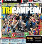 Mundo Deportivo: Saluti al TriCampeon 16/05/2011 di Ruggieri MUNDO DEPORTIVO BARCELLONA – Sul quotidiano Mundo Deportivo si parla della festa di ieri del Camp Nou che ha omaggiato il Barcellona vincitore per la terza volta consecutiva della Liga spagnola. Claudio Ruggieri – www.calciomercatonews.com