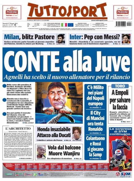 TUTTOSPORT JUVENTUS CONTE – Il probabile approdo in panchina di Antonio Conte è il tema caldo della giornata juventina, anche Tuttosport dedica la prima pagina a questo argomento.
