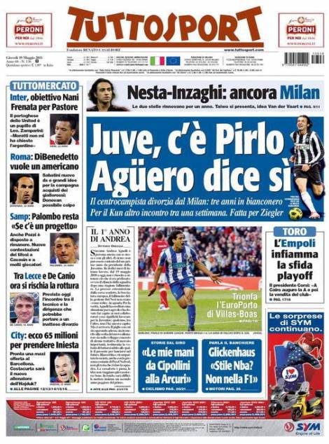 TUTTOSPORT JUVENTUS PIRLO AGUERO – Su Tuttosport si parla del mercato Juventus con i possibili arrivi di Pirlo e Aguero.