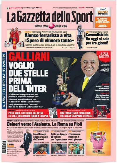 GAZZETTA DELLO SPORT RASSEGNA STAMPA PRIMA PAGINA – Intervista esclusiva all’amministratore delegato del Milan Adriano Galliani.