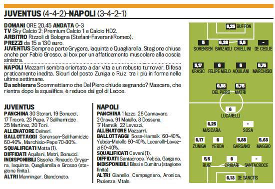 FANTACALCIO SERIE A PROBABILI FORMAZIONI JUVENTUS NAPOLI – Emozioni assicurate per il match tra Juventus e Napoli: i bianconeri vogliono chiudere la stagione con un risultato positivo contro il sorprendente Napoli di Mazzarri, dato nelle scorse settimane molto vicino al passaggio ai bianconeri. Le squadre per l’ultima giornata non cambieranno assetto tattico: per la Juventus il consueto 4-4-2 con Matri e Del Piero davanti ed a centrocampo Aquilani (per lui potrebbe essere l’ultima partita in bianconero). Il Napoli invece farà un po’ di turn over, con un attacco composto da Lucarelli supportato dalle mezze punte Sosa e Mascara: in difesa gli azzurri schiereranno il trio Ruiz-Santacroce-Cribari. Ecco le probabili formazioni proposte dalla Gazzetta dello Sport: