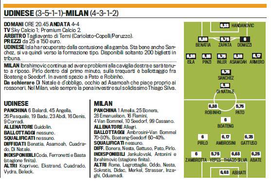 FANTACALCIO SERIE A PROBABILI FORMAZIONI UDINESE MILAN – Partita che si preannuncia esplosiva: Udinese-Milan sarà con ogni probabilità il match più spettacolare della giornata. La partita di andata, giocata a San Siro, si è conclusa con il pirotecnico punteggio di 4-4, con un Milan capace di rimontare fortunosamente all’ultimo dopo una partita di rara bellezza. Il ritorno promette bene: l’Udinese cerca un punto per guadagnarsi l’accesso ai preliminari di Champions League, il Milan invece ha già festeggiato ampiamente uno scudetto meritato, che mancava nella bacheca rossonera da ormai sette anni. I padroni di casa si affideranno alla coppia Di Natale-Sanchez, mentre i rossoneri risponderanno col duo carioca Robinho-Pato, supportati da Boateng. Ecco in foto le probabili formazioni della Gazzetta dello Sport: