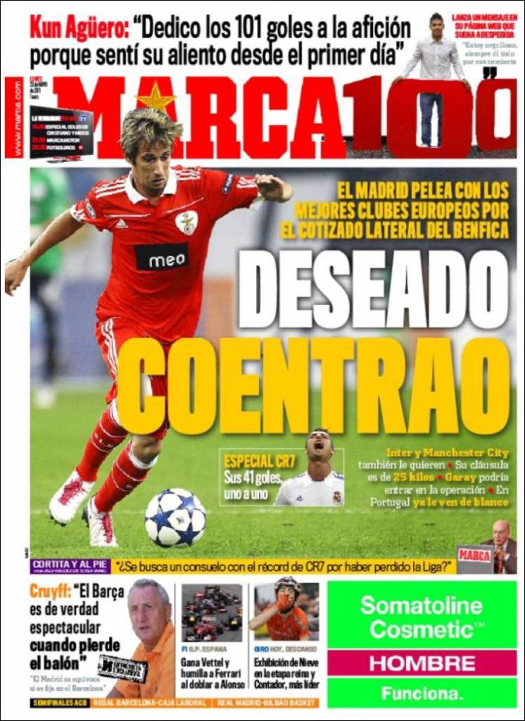 MARCA COENTRATO REAL MADRID – Sul quotidiano Marca si parla di Coentrao, terzino sinistro del Benfica che piace tanto al Real Madrid.