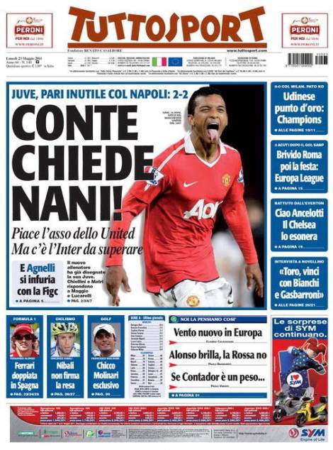 TUTTOSPORT CONTE NANI – Su Tuttosport si parla di mercato Juventus con Conte che avrebbe chiesto Nani del Manchester United.