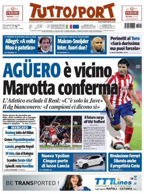 TUTTOSPORT AGUERO MAROTTA – Su Tuttosport si parla del futuro di Aguero molto vicino alla Juventus, come confermato da Marotta.