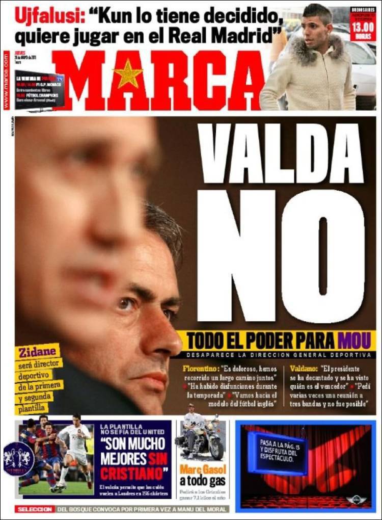 Marca: Valda No, tutto il potere a Mourinho 26/05/2011 di admin RASSEGNA STAMPA MARCA REAL MADRID VALDANO – Alla fine l’ha spuntata Mourinho, Jorge Valdano lascia il Real Madrid. Con la partenza del direttore sportivo, adesso tutto il potere è in mano al tecnico portoghese. Paolo Bardelli – calciomercatonews.com
