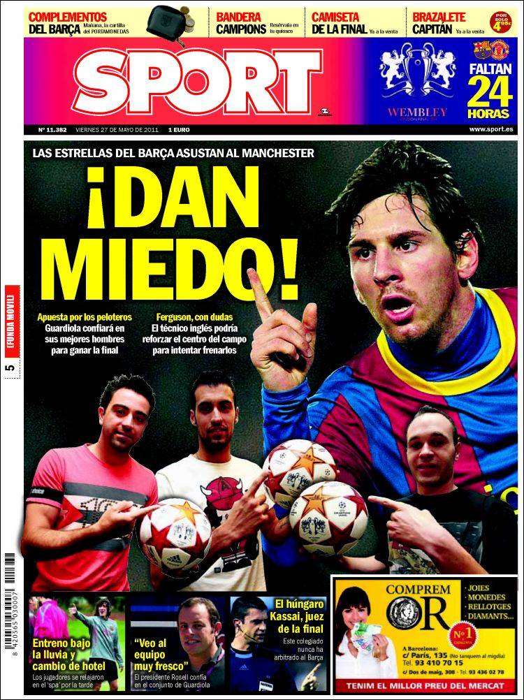 SPORT BARCELLONA – Sul quotidiano catalano Sport si parla della finale di Champions League tra Barcellona e Manchester United con i Red Devils spaventati dai grandi campioni del Barcellona.