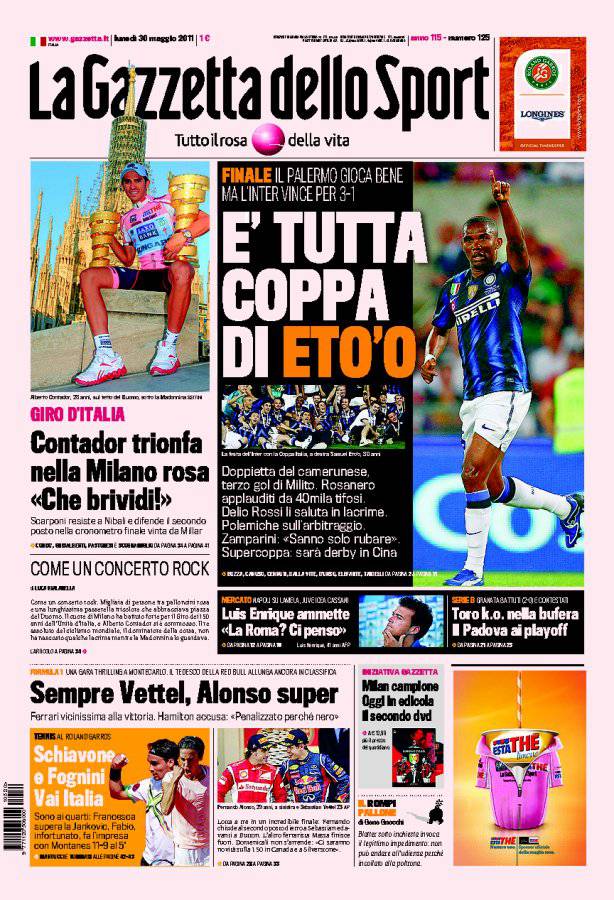 GAZZETTA ETO’O INTER – Sulla Gazzetta dello Sport si parla della vittoria dell’Inter nella finale di Coppa Italia contro il Palermo. Zamparini polemico.